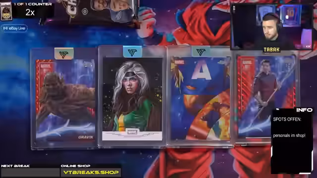 02:29:10Die Marvel-Breaks setzen sich fort, wobei noch mehrere Personal Cases und Boxen wie Inception Break Leon's Box geöffnet werden. Es werden weitere Karten mit hohem Wert wie Star-Lord, Queen Ramunda, Black Panther Shuri und NG2 gezogen. Das Design der Sketch-Karten wird erneut als extrem detailverliebt und beeindruckend beschrieben. Anschließend startet der hocherwartete Inception Break auf Ebay, der als eine der wichtigsten Aktionen des Abends angekündigt wird und speziell für dieses Event Cases enthält.