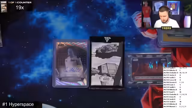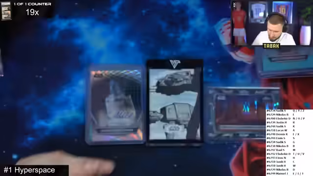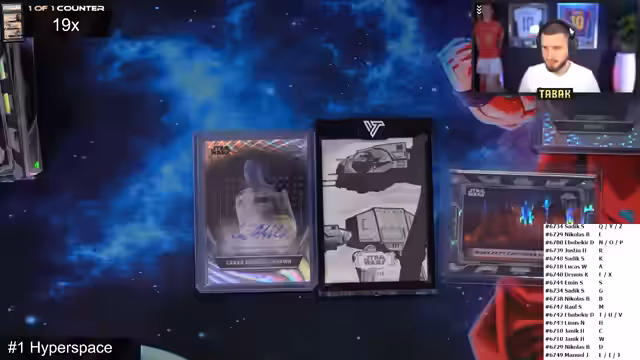 02:55:08Der lang erwartete Star Wars Hyperspace Break beginnt. Nach einer kurzen Regelanfrage, die die Zuordnung der Spots klärt, ist die Aufregung groß. Das erste Highlight ist der sofortige Zug einer "One-of-One"-Sketch-Karte, was für einen Teilnehmer eine große Freude und für alle eine eindrucksvolle Demonstration des Potenzials des Sets darstellt. Der Streamer gibt zusätzlich ein Fußball-Autogramm an den Gewinner.