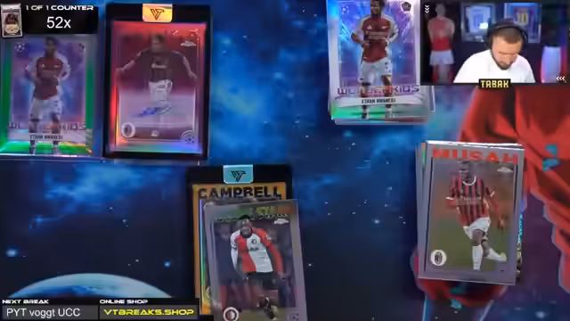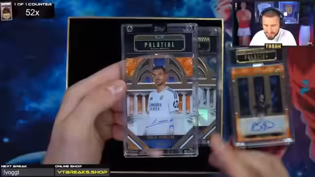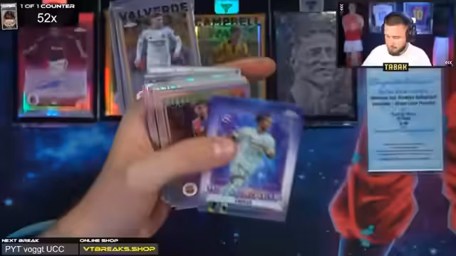 01:53:42Ein zentraler Punkt des Streams ist die Durchführung von Live Case Breaks. Dies geschieht für verschiedene Produkte wie UCC Chrome und Star Wars. Für die UCC Chrome Boxen werden die Boxen per Zufall auf die teilnehmenden Chatter verteilt. Die gezogenen Karten, wie z.B. ein Raphael Varane Auto 10/10, ein Endrick Rookie Auto 10/15 oder ein Xabi Alonso Auto 4/15, werden live präsentiert und bewertet. Die Breaks werden als stabil und geladen beschrieben und die Zuteilung der Boxen erfolgt sichtbar für die Community.