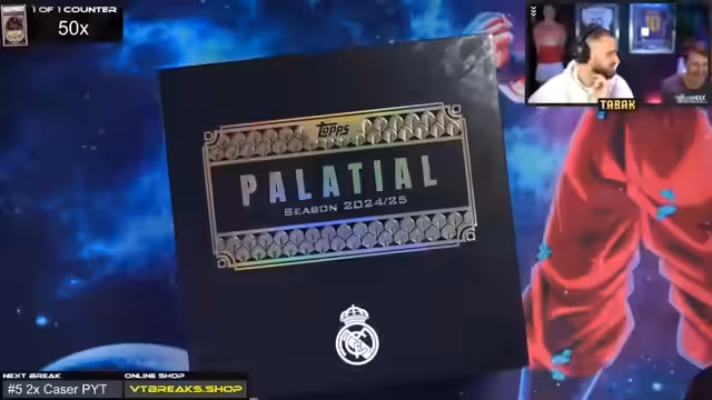 00:37:50Es wird die letzte Personalbox des Streams für den Käufer Ahmed geöffnet. Ahmed wählt per 'Schwimmungsmethode' eine Box aus und es werden solide Karten wie Joao Felix zu 25 und Noah Da Silva gezogen. Danach geht es zum Hauptevent des Streams: der Öffnung der 'Real Madrid Palacio'-Breaks. Für den ersten Break sind die Teilnehmer Samuel, Levente, Sinan, Adrian und ein zweiter Samuel bekannt. Die Atmosphäre wird als majestätisch und heiß beschrieben, da die Boxen sehr hochwertig sind und die Erwartungen der Community an die teuren Spots sehr hoch sind.