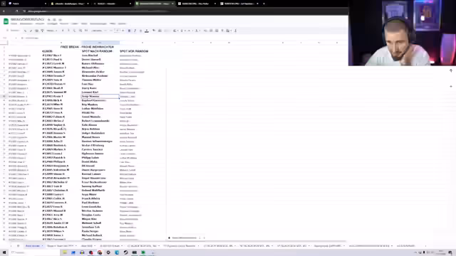 03:22:04Die Teilnehmer des Freebreaks werden bekannt gegeben, darunter Namen wie Alexander, Niklas, Bastian, Jens, Markus, Justin, Paul, Leon, Gerrit, Mike, Samuel, Ricardo, Leon und Florian. Es wird betont, dass die 50 Spots innerhalb von 10 Sekunden vergeben waren. Jeder Teilnehmer erhält einen Spot für 1 Euro. Die Bestellnummern sind den Spots zugeordnet, um eine eindeutige Identifizierung zu ermöglichen. Die Liste der zugewiesenen Spieler wird vorgelesen, wobei wichtige Zuteilungen wie Nico mit Tom Bischof, Paul mit Dieter Hoeneß, Noah mit Harry Kane und Kevin mit Stanisic genannt werden. Es wird erwähnt, dass die vollständige Liste aufgrund ihrer Länge nicht eingeblendet werden kann, und die Zuschauer gebeten, sich ihren Spieler zu merken oder einen Screenshot zu machen. Die Aufregung über die Vielfalt der Spots und die Schnelligkeit der Vergabe ist spürbar.