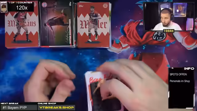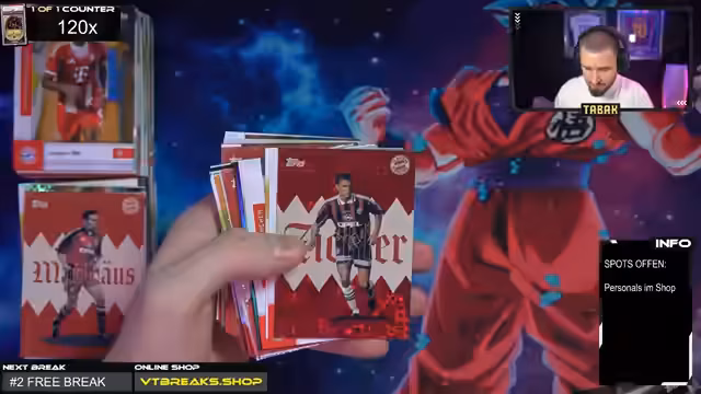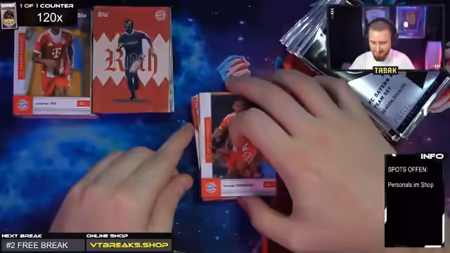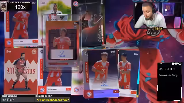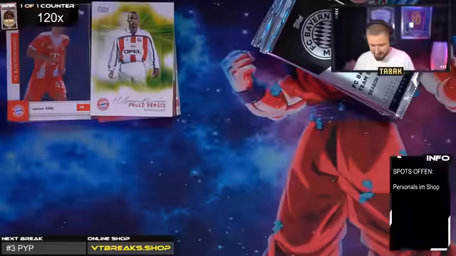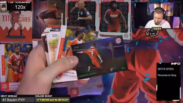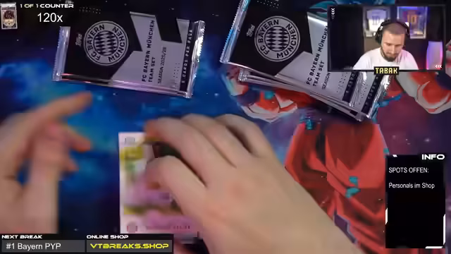 01:02:00Nach den Barca-Boxen von Ramon werden neue Boxen in den Shop gestellt und es wird angekündigt, dass in die Bayern-Breaks eingestiegen wird. Es wird erwartet, dass mindestens 60 Bayern-Boxen geöffnet werden, möglicherweise auch mehr, je nachdem, wie der Tag verläuft. Der Streamer erwähnt, dass er heute viele Zahlungen über PayPal und Spotify erhält. Es wird darauf hingewiesen, dass ein Case Barca 20 Boxen enthält, aber Barca seltener ist als Bayern. Die bisherigen Barca-Boxen werden als durchschnittlich gut bewertet, mit coolen Karten und erfüllten Erwartungen. Der Streamer verabschiedet sich von Alexander und bereitet sich auf die nächsten Schritte vor.