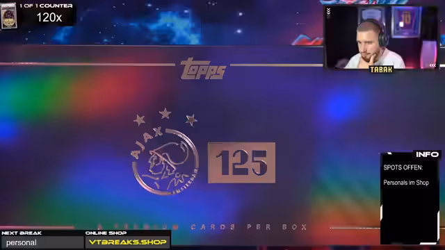 03:10:21Der Streamer bereitet den Ajax-Break vor, wobei eine Liste mit 50 Namen für den Freebreak erstellt wurde. Es werden die Hits des Ajax-Breaks präsentiert, darunter Alderweireld zu 49, Lippmannen zu 49, Raphael van der Vaart zu 25 und Michael Reiziger zu 4/10 als Autogramm. Eine Iconic Moments Karte zu 25 wird ebenfalls gezogen. Die Karten werden den jeweiligen Spot-Inhabern zugeordnet, wobei Frederic die niedrigst nummerierte Karte erhält (Reiziger zu 10). Pascal bekommt Van der Vaart, Iconic Moments und Lippmannen, während Markus Alderweireld erhält. Die besten Hits des vorherigen Bayern-Breaks werden noch einmal zusammengefasst, darunter Gnabry zu 5, Rainbow von Tom Bischoff und Uli Hoeneß Autogramm zu 25. Der Streamer kündigt den Start des Freebreaks an und überlegt, ob weitere Bayern-Breaks oder Personals online gestellt werden sollen. Der Streamer bereitet sich darauf vor, den Freebreak live zu starten und die lange Liste der Teilnehmer durchzugehen.