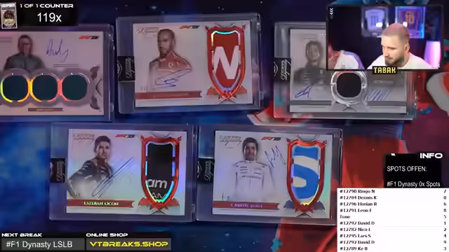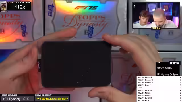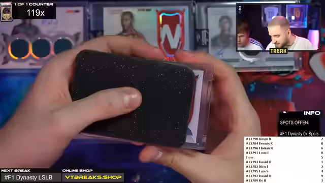 00:06:51Die Blackboxen werden geöffnet, sobald sie voll sind. Der Streamer erklärt den Boxbreak-Modus und zeigt die noch offenen Spots für den F1-Break. Es wird ein versiegeltes Dynasty Case präsentiert, dessen Öffnung mit großer Spannung erwartet wird. Es wird erläutert, dass normalerweise ein Booklet im Case enthalten ist und sehr oft eine One-of-One-Karte als Case-Hit. Die Community wird über die Regeln des Dynasty-Breaks informiert, bei dem die linke Seriennummer der Karte den Spot bestimmt, der die Karte erhält. Es gibt 10 Spots von 0 bis 9, wobei Spot 1 als besonders begehrt gilt, da er alle 1-von-X-Karten erhält. Zusätzlich wird angekündigt, dass jeder Teilnehmer, der nichts hittet, eine F1 Hobby Box Chrome als Trostpreis erhält, was als attraktiver Cashback-Bonus gesehen wird.