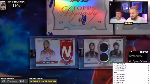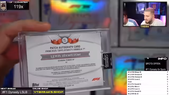 00:47:59Die erste Box des F1 Dynasty Cases wird geöffnet, und die Zuschauer sind sofort von der Premium-Verpackung beeindruckt. Die Spannung ist greifbar, als eine rote Karte zum Vorschein kommt, was Spekulationen über eine Louis Hamilton-Karte auslöst. Der Streamer ist sichtlich aufgeregt und hofft auf einen Patch und eine zu 5-Karte, die potenziell seine eigene sein könnte. Die Community wird aufgefordert, die erste Zahl von links auf der Seriennummer zu beachten, um den Spot zu identifizieren. Die Aufregung erreicht ihren Höhepunkt, als der Streamer glaubt, Louis Hamilton in der ersten Box gefunden zu haben, was die Erwartungen an den weiteren Verlauf des Breaks enorm steigert.