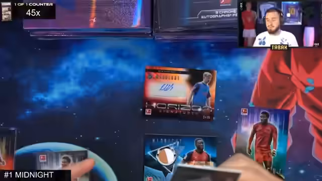 00:24:20Beim Einstieg in die ersten Box-Breaks gibt es technische Herausforderungen, wie angezeigte Probleme bei der App und unklare Spots. Der Streamer arbeitet daran, die verfügbaren Spots zu identifizieren, darunter Juventus Turin, Arsenal, Manchester City und andere Klubs. Es werden verschiedene Boxen geöffnet, darunter Midnight Bundesliga und SimpliSedad. Der Streamer zeigt besondere Karten wie Autogramme und Patch-Karten und kommentiert deren Wert und Seltenheit. Gleichzeitig werden Fragen von Zuschauern bezüglich Lieferungen und Zahlungen bearbeitet.