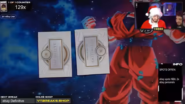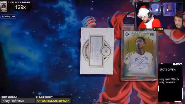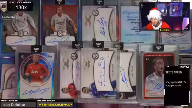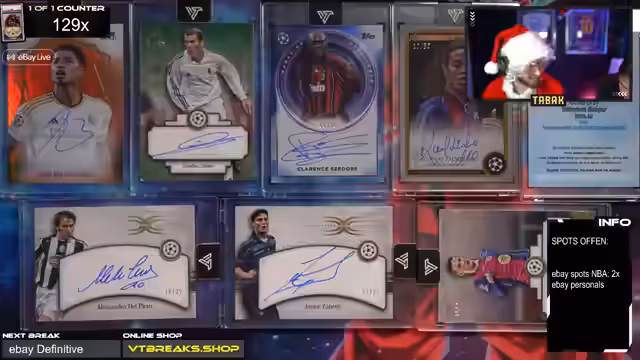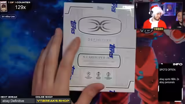 00:04:23Zeit 263-737: Vorstellung des Definitive Breaks, eines sehr teuren Fußball-Sets (weltweit nur ~100 Cases). Das Set wurde nach Community-Wunsch geöffnet und ist auf eBay Live ausverkauft. Lob an die deutsche Community für den Support, da Breaks in Deutschland neu sind. Ankündigung: Kein Stream an Weihnachten (nächste 3 Tage Pause), NBA-Break nach den Feiertagen (27./28. Dezember). Dual Stream mit World of Hoops (Micha) geplant.