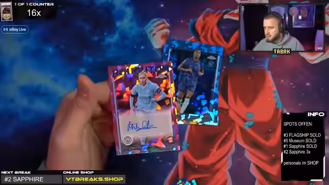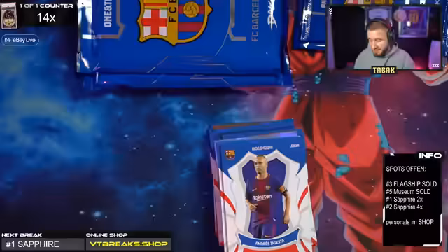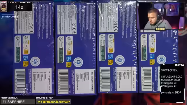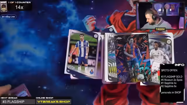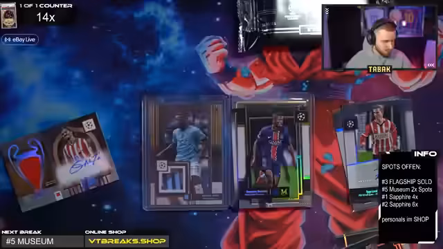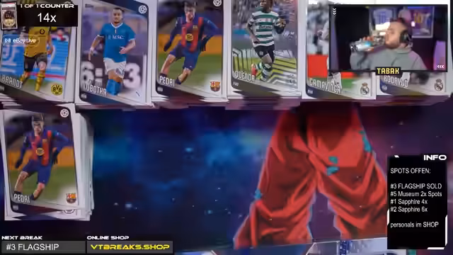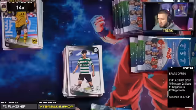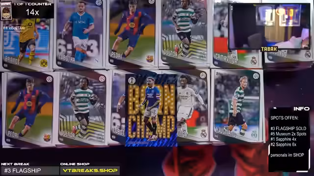 00:01:48Der Stream beginnt um 15 Uhr mit dem Begrüßungsritual für die Chat-Community. Der Moderator, Tabak, kündigt das heutige Programm an: Es stehen verschiedene Kartens breaks im Fokus, darunter F1 Chrome, One Piece OP14 und ein Museum Break. Außerdem werden die Champions-League-Spiele ab 21 Uhr thematisiert. Ein besonderes Highlight ist die Ankündigung von zwei Online-Case-Breaks zu F1 Chrome, die noch am Abend released und am Donnerstag im Stream geöffnet werden.