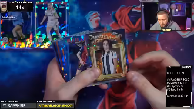 Es wurden ein Museum Case sowie ein One Piece OP14 Break durchgeführt. Im Fokus standen die Öffnung eines begehrten Sapphire Woman Case und der One Piece Museum Box. Dabei sorgten besondere Karten wie Two One-of-One Karten sowie verschiedene Rares und Secret Rares für große Aufregung bei den Teilnehmern.