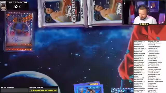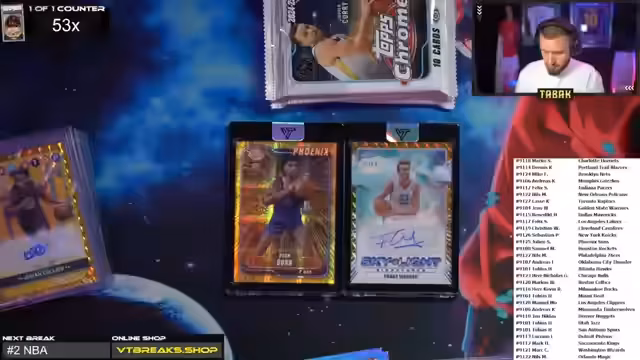 01:40:08Der Streamer wechselt nun zum NBA Break. Er gibt an, dass es noch elf offene Spots für den Break gibt. Nach der Raffle für die Spots werden die Teams verteilt. Der Streamer preist das Design der NBA-Karten im Vergleich zur UEFA Chrome Serie. Es werden Rookies, Inserts und Autogramme gezogen. Der Streamer unterhält sich auch über teure NBA-Karten und den Hype um bestimmte Spieler.