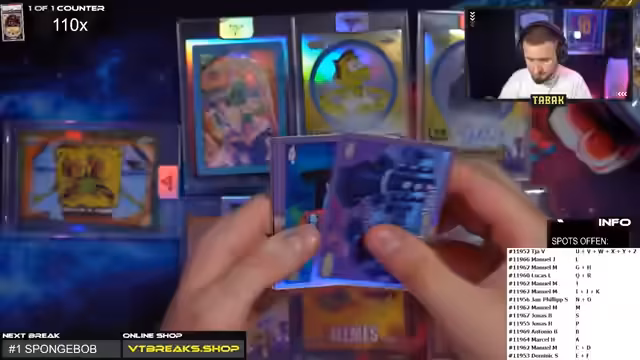 04:13:18Der Spongebob Break startet live mit einer Vielzahl von Teilnehmern, hauptsächlich deutschen Namen. Die Teilnehmer und ihre jeweiligen Spots werden aufgelistet, und die Karten werden gezogen. Hierbei werden auch sehr wertvolle und seltene Karten wie ein Autogramm und eine Meme-Karte gezogen, was für viel Aufregung im Chat sorgt. Es werden auch besondere Aktionen wie ein Raft zwischen den Teilnehmern veranstaltet.