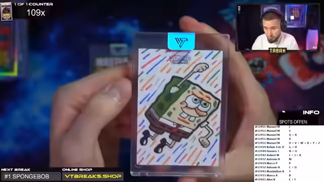 00:57:37Während der Öffnung der zweiten Spongebob-Box für Manuel wird eine extrem seltene Plankton-Sketch-Karte gezogen. Dies ist die 108. One-of-One-Karte, die in diesem Jahr auf dem Kanal verlost wurde. Der Streamer äußert seine Begeisterung und die der Community, da diese Karten bei Sammlern sehr begehrt sind. Nachfolgend erscheint eine weitere Number-Karte zu 199, gefolgt von einer Autogrammkarte von Tony Fast Jr. und diversen Meme- und Review-Karten.