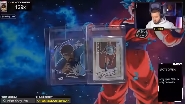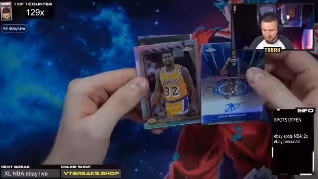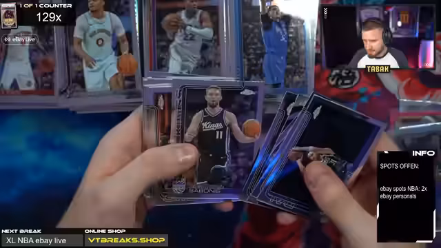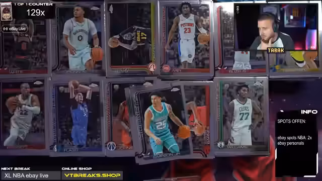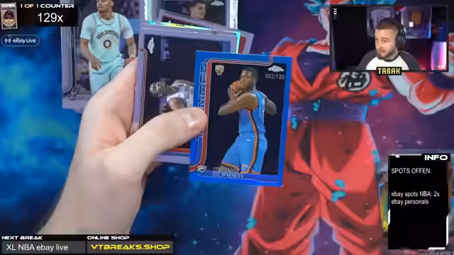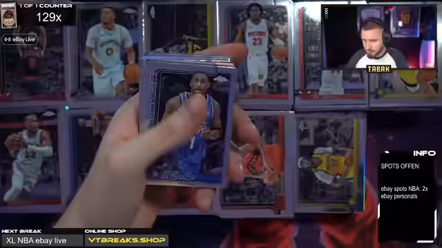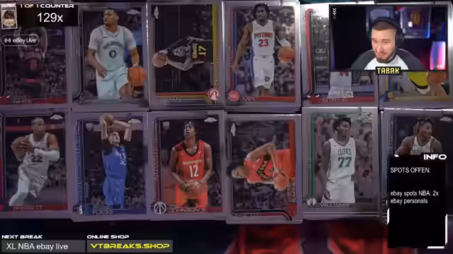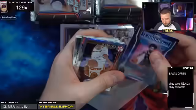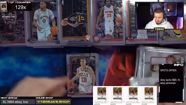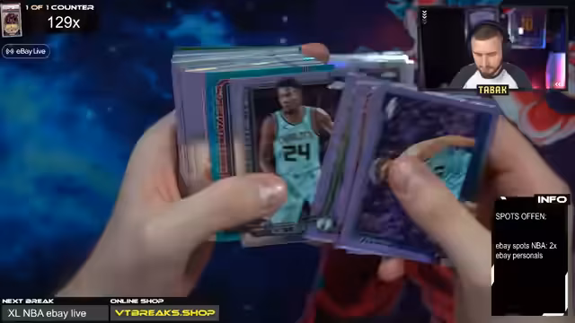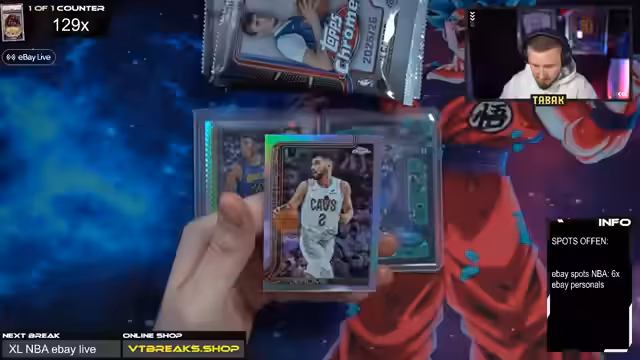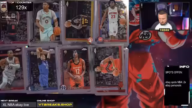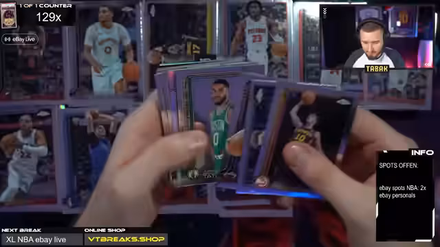 02:04:44Der Streamer eröffnet den XXL NBA Chrome Break auf eBay Live und betont, dass dies erst der zweite Break auf dieser Plattform ist. Trotz der Größe des Breaks wurde dieser schnell gefüllt, was er der Community zuschreibt. Nach den Begrüßungswünschen startet er mit der Kartenöffnung und erklärt, dass er bei der rechten unteren Box beginnt. Er prüft die Sichtbarkeit der Karten für die Zuschauer und erwähnt den kroatischen Spieler Zubatsch. Während des Öffnens werden erste Hits wie Caruso und Maxi zu 299 für die Philadelphia Sixers gezogen.