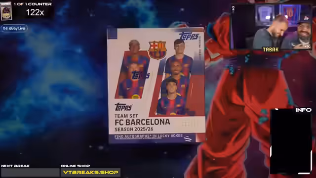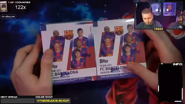 00:53:55Vor dem Start der Dynasty-Boxen wird ein letztes Giveaway auf Twitch veranstaltet, um die Zuschauer auf Ebay Live zu locken. Eine Barcelona-Box wird unter dem Hashtag #Messi verlost, um die Messi-Karte zu beschwören. Der Fahrplan für den Abend wird bekannt gegeben: Zuerst werden die Dynasty-Boxen für Dennis und David geöffnet, gefolgt von einer Auktion für BVB-Boxen und schließlich das Personal Case des Streamers. Die Community entscheidet, welches der beiden Dynasty-Cases für Dennis und David ist. Die Spannung erreicht ihren Höhepunkt, während die letzten Vorbereitungen für die lang erwarteten Dynasty-Breaks getroffen werden.