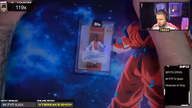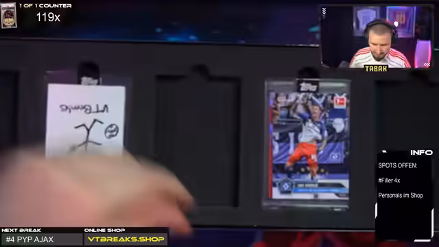00:59:57Der zweite Random Spot Break für Ajax Amsterdam, Hashtag 2, beginnt. Die erste Autogrammkarte ist Frank Rijkaard zu 25, eine stabile Legende. Es folgt Michael Reiziger zu 49 (Auto). Eine weitere Karte ist Dennis Bergkamp zu 49 (Auto), der als einer der größten Stürmer seiner Generation gilt. Johann Neskens zu 25 ist ebenfalls enthalten. Die letzte Autogrammkarte der Box ist Patrick Kluivert zu 10, nummeriert 3 von 10. Der Streamer bewertet Kluivert als den besten Hit dieser Box, gefolgt von Bergkamp und Rijkaard. Er stellt fest, dass die „Brecherbox“ mit einem One-of-One oder Triple Auto noch nicht gefunden wurde. Die Namen der Teilnehmer (Michael G., Calvin H., Jan A., Elias M.) und die gezogenen Karten werden erneut randomisiert, wobei Elias Raikard, Michael G. Reiziger, Jan Neskens, Calvin Kluivert und Michael G. Bergkamp erhalten.
