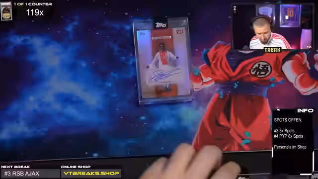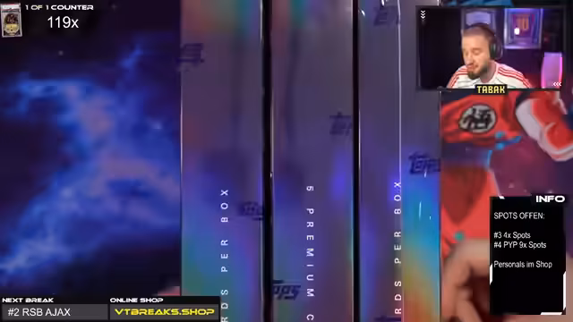 00:08:59Der Streamer kündigt an, dass die Tabelle für die Teilnehmer bereits angelegt ist und die Zuschauer über den Befehl „Ausrufezeichen-Shop“ auf die Webseite gelangen können. Er informiert darüber, dass heute Ajax Amsterdam Produkte geöffnet werden. Für den morgigen Stream ist die Öffnung eines Bayern-Team-Sets geplant, dessen Box kurz präsentiert wird. Er erwähnt, dass er heute Beine trainiert hat und kaum noch gehen kann, was die physische Anstrengung unterstreicht. Das Bayern-Team-Set ist angekommen und wird morgen einige Breaks beinhalten. Es wird auch kurz das neue Marvel-Set erwähnt, welches cool aussieht, aber dessen Erscheinungsdatum noch unklar ist. Das Museum-Set wird voraussichtlich Ende des Jahres, in etwa einem Monat und einer Woche, veröffentlicht.
