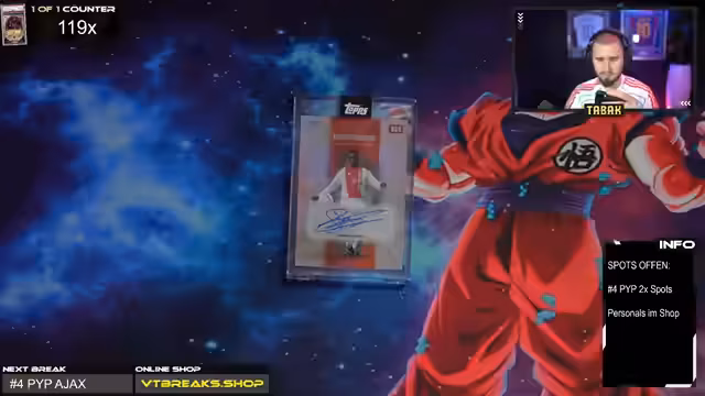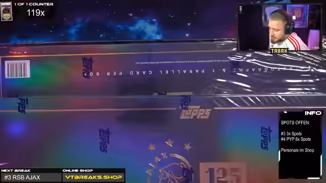 01:23:35Der Streamer reagiert überrascht auf die hohen Auktionspreise für Karten, wie einer Topps Now One-of-One-Fraktur-Karte für 22.000 Dollar. Er mutet dem Bitcoin-Millionären zu, dass es ihm nicht mehr auf den Preis ankommt. Gleichzeitig ist die Lage bei den Spots für den AJAX Break noch nicht ganz ausverkauft und es wird um Akquise von Käufern gebeten. Ein paar Karten werden dann doch noch ausverkauft.