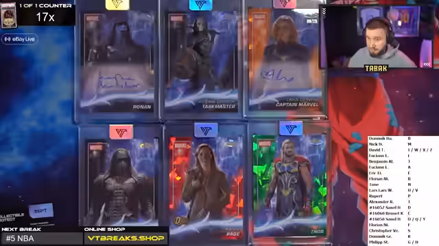 03:40:30Der Break geht mit wertvollen Karten weiter. Es werden Karten wie Nebula zu 99 und eine One-of-One Karte von Rocket Raccoon gezeigt, was im Chat für große Aufregung sorgt. Der Streamer betont die Seltenheit und den Wert dieser Karten. Es werden auch weitere Charaktere wie Thor, Wong und Mephisto behandelt, wobei Mephistos Debut besonders hervorgehoben wird. Die hohe Qualität des Breaks wird immer wieder von den Teilnehmern und im Chat bestätigt.