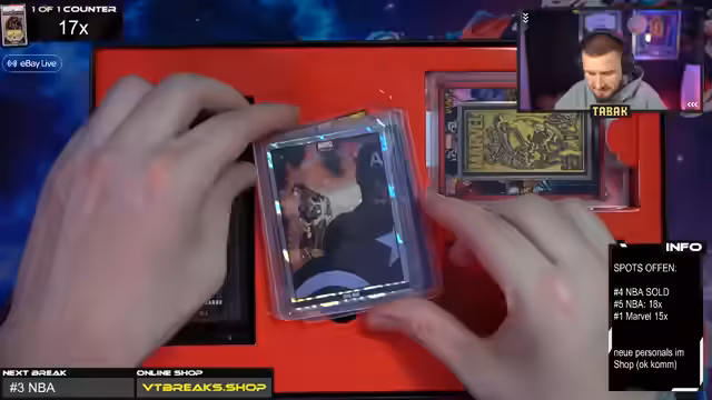 01:16:45Der Streamer kündigt an, den Marvel Sapphire Break direkt nach dem NBA Break zu starten, nachdem er einen Update für die Einzelkartenpreise bei Dylan Harper gibt und die hohe Nachfrage für Spider-Man-Toys erwähnt. Kurz darauf werden Silberprodukte im Shop vorgestellt, nämlich eine 2-Unzen-Silbermünze nummeriert bis 1000 und Marvel- sowie Toy-Story-Sticker. Der Streamer äußert sich auch zur Qualität der internationalen Stars Set-Checkliste.