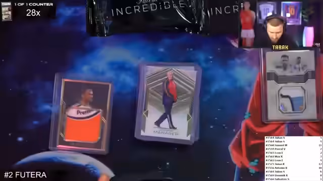02:45:30Eine zweite Futera-Incredibox Box wird geöffnet. Die Teilnehmer werden bekannt gegeben. Streamer weist darauf hin, dass Kanal kein offizieller Futera-Partner ist, aber trotzdem Chancenhafte Karten ziehen konnte. Es wird für den kommenden Sonntag ein weiterer Break mit dreimal Futera angekündigt. Des Weiteren wird der Vorschlag gemacht, im Stream ein Pack zu verlosen. Die Zuweisung der Packs für die Teilnehmer wird im Sniping-Tool sichtbar gemacht.