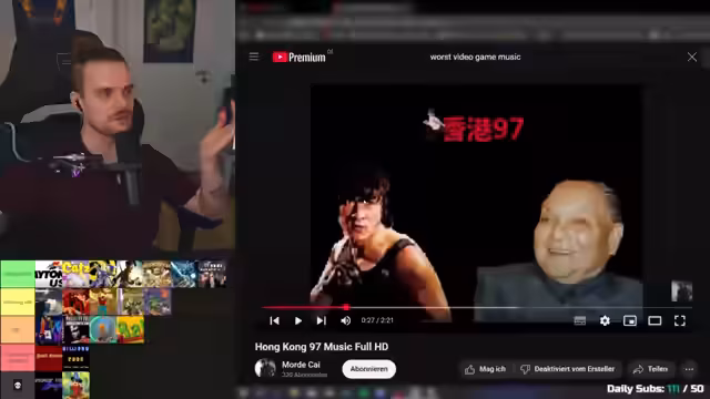 00:25:06Der Streamer kündigt den Beginn der Tierlist für die schlechteste Videospielmusik an und nimmt dafür live ein YouTube-Intro auf. Er erklärt das Format, bei dem er Gameplay-Szenen zeigt, bevor er die jeweiligen Songs bewertet. Die Kategorien der Tierlist sind 'Banger', 'Geht eigentlich voll', 'Uff', 'Aua meine Ohren' und 'Rip in Peace'. Der erste Track ist 'Versus' aus dem Spiel Sonic Eraser, der als extrem penetrant und ohrenbetäubend empfunden wird und in die Kategorie 'Aua meine Ohren' eingeordnet wird. Als nächstes wird Pit Fighter besprochen, ein altes Fighting-Game, dessen Team-Song überraschend positiv aufgenommen wird und in die Kategorie 'Geht eigentlich voll' kommt. Danach folgt Balls 3D, dessen Teamsong als 50% sexual und 50% goofy beschrieben wird und in die Kategorie 'Uff' eingeordnet wird. Street Fighter 1 wird mit dem Mike Theme besprochen und in die Kategorie 'Geht eigentlich voll' eingeordnet.