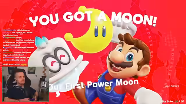 02:13:53Der Streamer ist auf der Suche nach dem letzten Mond im Reich und sammelt dabei ungewollt Münzen, die er aufgrund der Challenge eigentlich meiden müsste. Parallel dazu unterhält er sich mit der Community über Nostalgie-Themen, darunter das Verschwinden von Geschäften wie GameStop und die Wiederkehr von Getränken wie Punica. Er erinnert sich an alte Kaugummisorten wie Fivecam und an Kuh-O-O, dessen Maskottchen ein Alien war und das in Japan noch existiert. Des Weiteren erwähnt er den Dönerstag in einem ehemaligen Kölner Döner-Restaurant, der durch extrem große und damals teure Döner bekannt war.