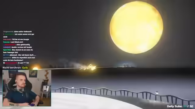 01:50:02Nach den vielen挫折 im Wüstenland versucht der Streamer, sein Glück im Seeland (Lake Kingdom). Er ist weiterhin hochgradig nervös und macht sich über mögliche Fehler sorgen. Die Verwirrung um die deutschen und englischen Namen der Königreiche, wie Seeland und Küstenland, wird kurz erwähnt. Während des Versuchs, einen Mond ohne Kontakt zu gelben Elementen zu sammeln, macht er jedoch einen Fehler. Obwohl der Chat behauptet, er habe eine gelbe Treppe berührt, kann er das aufgrund von technischen Problemen mit der Aufnahme nicht selbst überprüfen. Enttäuscht und wütend über den nicht beweisbaren Regelbruch und den Mangel an Vertrauen in seine Community, startet er schließlich den gesamten Stream noch einmal von vorne.
