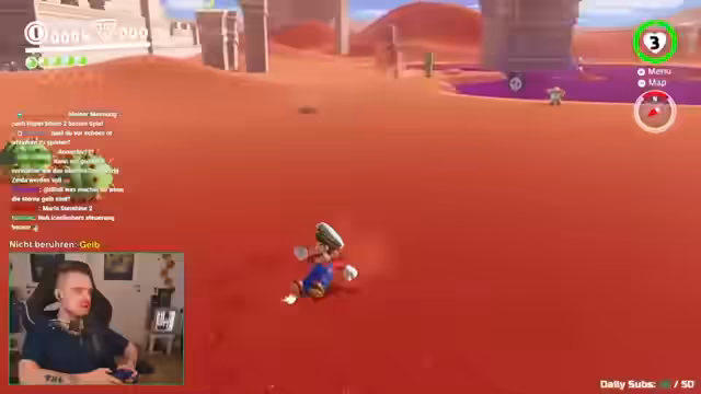 01:49:45Es wird die Verwirrung um die deutschen Namen der verschiedenen Königreiche in Mario Odyssey thematisiert, insbesondere die Unterschiede zwischen Lake Kingdom (Seeland) und Seaside Kingdom (Küstenland). Die Schwierigkeit, im Wüstenland Monde zu sammeln, ohne die Farbe Gelb zu berühren, wird hervorgehoben. Es wird überlegt, welche Monde noch sicher eingesammelt werden können, wobei die Sphinx und ein Raum mit gelbem Boden als problematisch identifiziert werden. Die Schafsmission wird als relativ sichere Option in Betracht gezogen. Es wird auch überlegt, ob man die Slots machen soll, aber es ist unklar, ob man dabei gelbe Treppen berührt. Es wird versucht, dies in der Aufnahme zu überprüfen, aber es gibt technische Probleme.