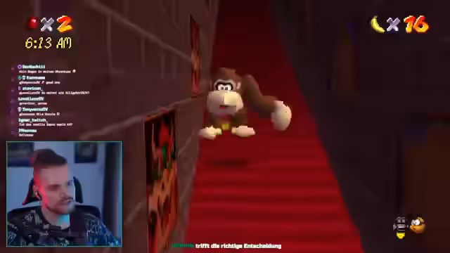 01:40:21Der Stream beginnt mit einem ungewöhnlichen Vorhaben: Das Spiel wird von Mario 64 in Donkey Kong Bananza geändert, aber ohne das Spiel selbst zu wechseln. Stattdessen wird eine Mod installiert, die es ermöglicht, den Charakter Donkey Kong aus Donkey Kong Benanza in der Welt von Mario 64 zu spielen. Donkey Kong besitzt sein komplettes Moveset inklusive Longjumps, Rollen und der Fähigkeit, einen Stein zu greifen und darauf zu surfen, was eine völlig neue Dynamik in die bekannten Level bringt. Ziel ist es, das Spiel mit diesen neuen Fähigkeiten durchzuspielen.
