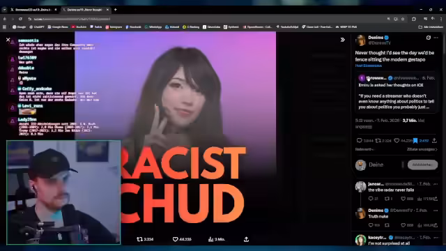 00:31:45Ein weiteres Hauptthema ist der Shitstorm, in den die Streamerin Amaru geraten ist. Auslöser war ein Tweet, in dem sie sich nach einer Frage zur US-Behörde ICE auf Twitter äußerte und behauptete, kein Politiker zu sein. Dies führte zu massiver Kritik, ihr wurde Ignoranz und sogar Rassismus vorgeworfen. Eine politische Streamerin namens Nisse kritisierte Amaru scharf und erstellte ein Meme-Bild, das sie als rassistische Tussi darstellen sollte. Amaru reagierte darauf später mit einem ausführlichen Statement, in dem sie betonte, aus dem Kontext gerissen worden zu sein und sich mit menschlichem Mitgefühl gegen ICE positionieren zu wollen.