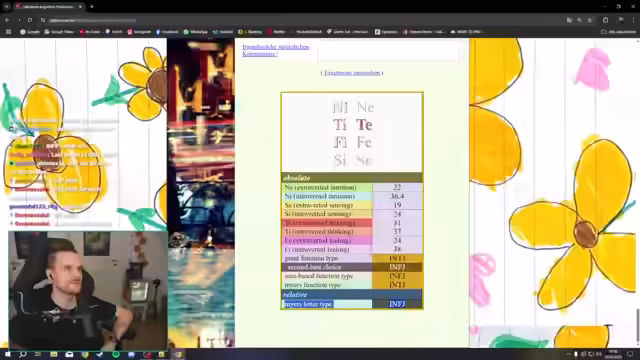 00:39:40Nach langer Zeit plant der Streamer wieder einen MBTI-Persönlichkeitstest (Myers-Briggs Type Indicator), da er vermutet, dass sich seine Persönlichkeit durch seine Therapien seit 2021 geändert haben könnte. Er erklärt, dass es sich bei MBTI nicht um eine exakte Wissenschaft, sondern um ein Spektrum handelt und betont, dass Tests durch psychische Probleme beeinflusst werden können. Er geht auf die Fragen des Tests ein, wobei er sich bei vielen Antwortmöglichkeiten in der Mitte positioniert und über sein Verhalten in sozialen Situationen reflektiert.