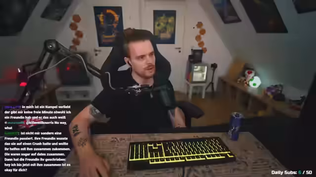 00:12:33Der Streamer erzählt von einem persönlichen Konflikt. Sein bester Freund wusste von seinem Crush, sicherte ihm aber zu, dass es nichts zwischen ihm und ihr gibt. Der Streamer hat daraufhin Vertrauen verloren, weil er das Verhalten seines Freundes als Sas gegenüber vermutet. Er äußert seine Unfähigkeit, diesem Freund noch zu vertrauen, und sucht nach Tipps, wie er damit umgehen soll. Er fragt, ob er seinen Freund komplett meiden soll.
