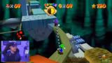 01:16:14Beim zweiten Versuch der selben Mission überlegen sie eine neue Taktik, indem sie auf eine kleine Insel springen und versuchen, sich per Propeller-Mütze zu helfen. Auch hier werden sie sofort massiv von den Zuschauern angegriffen und in die Lava gestoßen. Nachdem sie gescheitert sind, diskutieren sie die fehlende Möglichkeit, sich im Level wiederzubeleben und spawnen stattdessen vor dem Level-Eingang neu.