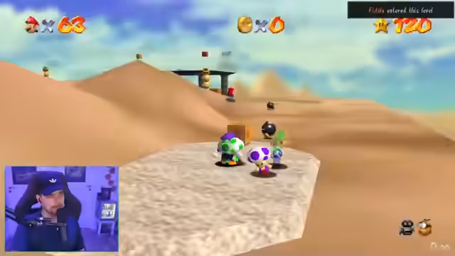 00:33:57Der erste Versuch beginnt im Schloss-Wüstenlevel, Ziel ist es, einen auf einem Turm befindlichen Stern zu erreichen. Trotz guter Startpositionen und der Unterstützung durch einen dritten, sprungkräftigen Spieler, haben die Toads die Oberhand. Die Kommunikation und Koordination zwischen den beiden angeketteten Spielern ist schwierig, was zu mehreren Todesstürzen führt. Der Timer läuft ab, ohne dass der Stern erfolgreich eingesammelt werden konnte, und die Toads erhalten den ersten Punkt.