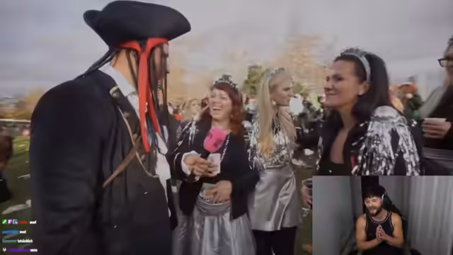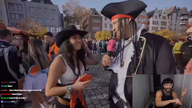 01:35:21Der Streamer gibt vor, über einen Zaun gehüpft zu sein, um ohne Ticket auf das Festival zu gelangen, und versucht, einen Security-Mitarbeiter zu überreden, ihn hineinzuschleusen. Er fragt nach Pausenzeiten der Security, um Wertsachen zu klauen, und schlägt eine „Halbe-Halbe“-Vereinbarung vor. In einer weiteren Szene wirft er sich auf den Boden und schreit um Hilfe, indem er vorgibt, angegriffen worden zu sein, was zu einer humorvollen Eskalation führt. Diese provokativen und übertriebenen Handlungen sind Teil des Comedy-Konzepts und sollen das Publikum überraschen und amüsieren.