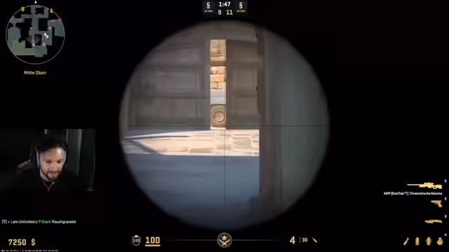 05:50:19Das Spiel gleitet in hochriskante Situationen ab, in denen sich der Streamer in engen Räumen wie 'Cave' bewegen muss. Er nutzt intelligentes Movement, um sich zu verteidigen und Gegner auszumanövrieren. Gleichzeitig versucht er, seine Mitspieler mit Waffen und taktischen Hilfsmitteln wie Flashes zu unterstützen. Der Fokus liegt darauf, überraschende Angriffe zu initiieren und gleichzeitig sich selbst durch geschickte Positionierung in Deckung zu bringen, was zu mehreren dramatischen, aber letztlich erfolgreichen Duellen führt.