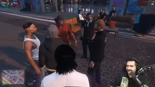 04:35:13Die Szene beginnt mit einer angespannten Konfrontation, bei welcher der Handgelenke gefesselt sind und die Forderung besteht, die Handschellen abzulegen. Die Lage eskaliert, als eine angebliche Granate ins Gespräch gebracht wird. Ein Beamter des LSPDs, Omar Aziz, versucht, Herrn Salami zu befragen und möchte wissen, warum dieser eine Granate geworfen hat. Salami ist aggressiv und verlangt die Anwesenheit seiner Ex-Frau, um überhaupt zu reden. Die Situation istchaotisch und unkontrollierbar, was die Beamten zwingt, aufgrund der Eigen- und Fremdsicherung Handschellen anzulegen, was Salami zusätzlich wütend macht.