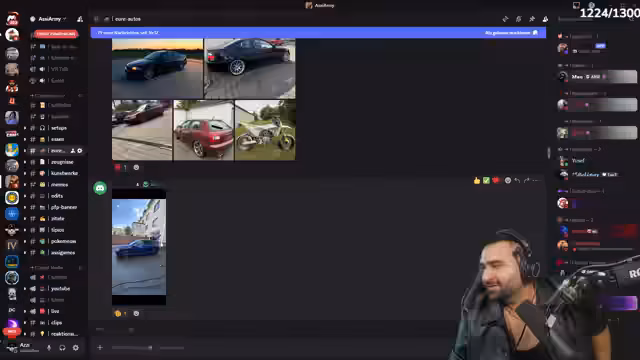 00:35:17Nach den Setups wechselt der Streamer zum Thema Autos. Die Zuschauer senden Fotos ihrer Fahrzeuge, hauptsächlich BMWs, aber auch Mercedes, Audis und Porsches. Der Streamer bewertet die Autos ebenfalls mit Punkten, kommentiert die Marken, Modelle und Farben, wobei er eine Vorliebe für ältere Modelle zeigt. Oft stellt er die Frage nach dem Finanzierungsweg und scherzt über "Fake-Bilder" und "Casino-Deals" bei teureren Fahrzeugen.