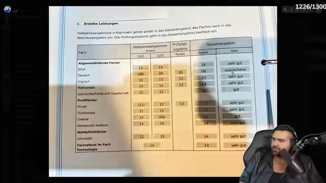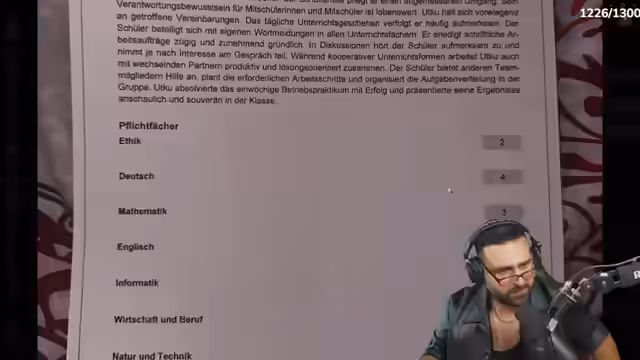 01:02:04Abschließend wendet sich der Streamer den Zeugnissen der Zuschauer zu. Er analysiert Noten, Fächer und Versäumnisse oft mit Humor und scharfer Kritik, insbesondere bei Deutschleistungen, die er bei vielen Zuschauern als schlecht identifiziert. Er zweifelt an der Echtheit mancher Zeugnisse, insbesondere wenn alle Noten schlecht oder extrem gut sind, und kommentiert die Versäumnisse von Schülern, was er als inakzeptabel ansieht.