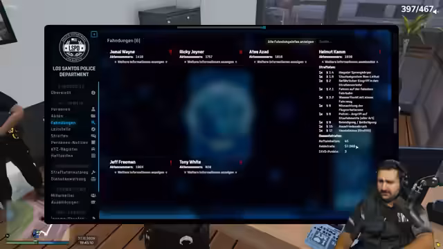 01:44:16Nachdem die Wut eine Weile abgeklungen ist, konzentriert sich der Streamer darauf, den Vorfall offiziell zu bearbeiten. Er erstellt im System des Polizeidienstes (PD) eine Fahndung gegen Helmut Kamm. Detailliert werden die Vorwürfe Vandalismus, illegaler Waffenbesitz durch eine Granate und versuchter Mitter aufgelistet. Ein Zeuge wird als Beweis benannt, um die Glaubwürdigkeit der Anklage zu sichern.