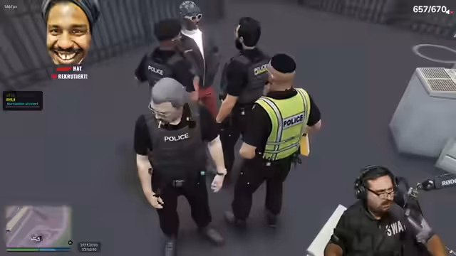 01:48:09Der Streamer patrouilliert weiter, als er das von Helmut genutzte Fahrzeug im Scanner erkennt. Bei einer allgemeinen Verkehrskontrolle eskaliert die Situation erneut. Helmut beleidigt den Streamer, was zu einer Festnahme wegen Beamtenbeleidigung führt. Die Polizeikontrolle gerät ins Stocken, da der Streamer sich an diesem Tag nicht vollständig ausgerüstet fühlt und seine Kollegen in der Wahrnehmung seiner Rolle als Vorgesetzter ebenfalls unkooperativ wirken.