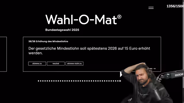 01:21:34Ein Großteil des Streams widmet sich der Abfrage und Diskussion politischer Standpunkte. Der Streamer gibt dabei klare Meinungen zu verschiedenen Themen ab, wie etwa die Ablehnung militärischer Unterstützung der Ukraine für die Ukraine, die Befürwortung gesetzlicher Mietpreiskontrollen und die Ablehnung einer allgemeinen Tempolimit-Pflicht auf Autobahnen. Die Beschäftigung mit den Parteien wird jedoch nach kurzer Zeit zugunsten eines selbstbewussten 'Ich bin links' abgebrochen, mit dem Hinweis, dass er in Deutschland nicht wahlberechtigt sei.