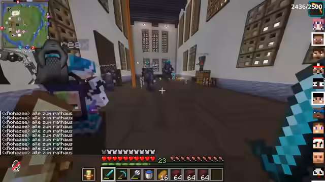 05:48:16Um 22:15 Uhr wird eine Gruppe (Gigant, Monte, Trimax, Norax, Ali, Rose, Azzy, Eli) zum Rathaus einberufen. Ziel ist es, das Ranking-Game vorzubereiten. Dabei kommt es zu kleineren Störungen, wie dem Diebstahl einer Enderchest und anschließenden Diskussionen über Regeln im Rathaus (kein Töten oder Griefen). Der Streamer erklärt detailliert die Spielmechanik: Es werden Schilder mit Zahlen (1-7) aufgestellt, und die Teilnehmer ordnen sich basierend auf gestellten Fragen (z. B. 'Wer ist am nervigsten?') selbst ein. Der Prozess erfordert Absprachen und gelegentliche Neubewertungen.