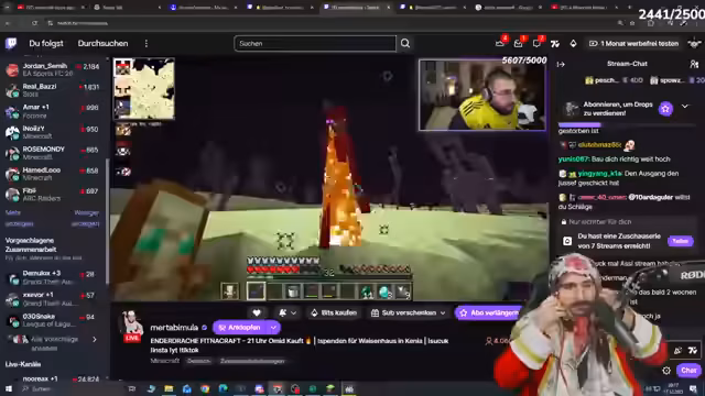 07:34:57Der Streamer kämpft gegen Mobs und versucht erfolglos MLG-Manöver (z. B. Wasserflaschen-Werfen bei Fallschaden). Er sucht nach Totems für Schutz und erwähnt einen angeblichen MLG-Turm im Kaiserreich-Bereich. Später testet er ohne Totem einen Sprung in ein dunkles Loch, scheitert aber aufgrund von Sichtproblemen und Falling-Mechaniken. Seine Frustration über die peinlichen Missgeschicke wird deutlich, als er sich im Chat bloßgestellt fühlt.