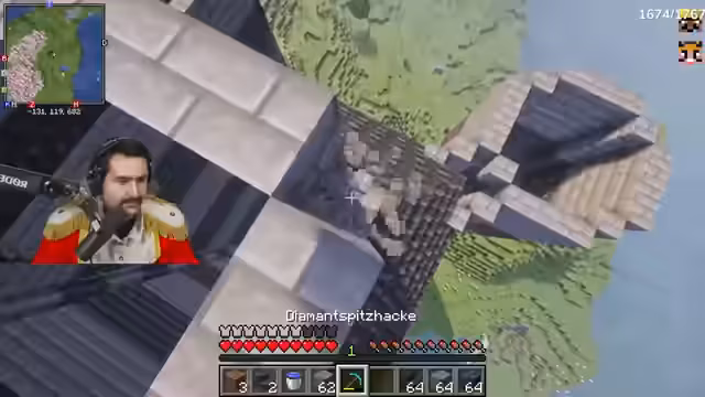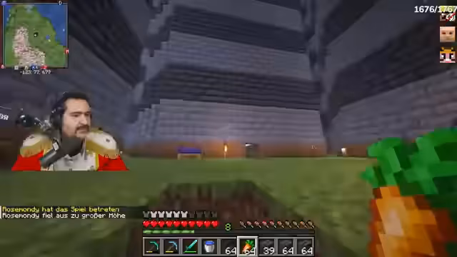02:21:31Die Arbeiten an der Burg werden fortgesetzt, nachdem eine Umfrage im Chat ergab, dass für eine Stunde RP gestimmt wurde, was aber nicht alle Zuschauer befriedigt. Der Streamer hat Bedenken, dass die Burg durch TNT zerstört werden könnte, und erwähnt, dass ein Zuschauer, Micky, solche Pläne geäußert hat. Während des Bauprozesses werden Blöcke wie Schiefertafeln verwendet, und ein Diamant wird als Schmuckstück integriert, wobei darauf geachtet wird, die Basis sicher zu verschließen, um Diebstähle zu vermeiden.
