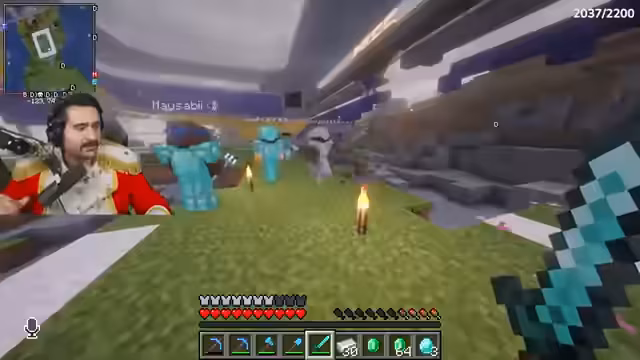 09:20:44Ein Spieler präsentiert den Bau einer zentralen Friedensbasis, die als zentraler Treffpunkt dienen und unendliche Ressourcen wie Eisen und Emeralds für alle bereitstellen soll. Die Gruppe diskutiert die Einrichtung eines sicheren Gebiets für den gemeinsamen Nutzen. Es folgt ein Austausch von Ressourcen, bei dem unter anderem Deepslate und verbesserte Werkzeuge angeboten werden. Die Stimmung hellt sich auf, und es gibt konkrete Hilfsangebote, wie das Verzaubern von Axt und Spitzhacke für andere Spieler.
