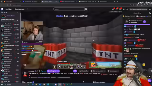 05:25:01Nach weiteren Provokationen startet der Streamer die geplante Sprengung einer gegnerischen Burg. Während der Vorbereitungen – darunter die Herstellung von Feuerzeugen und die Beschaffung von Sand – kommt es zu ersten Explosionen. Der Streamer reagiert emotional, als seine eigene Basis beschädigt wird, und beschuldigt Noreax und dessen Gruppe, durchgängig angegriffen zu haben. Paradoxerweise lobt er später die Aktion als 'geil', zeigt aber auch Angst vor Shitstorms seitens der Minecraft-Community. Die Situation eskaliert, als weitere Spieler in den Konflikt einsteigen und die Zerstörung noch größer wird.