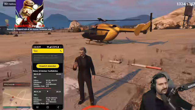 03:50:33Nachdem das vorherige Rollenspiel eskaliert ist, wechselt der Streamer das Szenario. Er plant nun einen Raubüberfall mit einem Helikopter, um eine Gang auszurauben. Dies beinhaltet die Vorbereitung, das Beschaffen von Waffen und die Organisation des Fluges. Das Rollenspiel wird hierbei unterbrochen durch technische Notizen, wie die Funktion des Helikopters und der Flugfunk, und durch die absurde Interaktion mit der 'Gefangenen' Fatma während des Fluges.