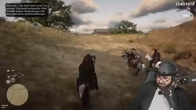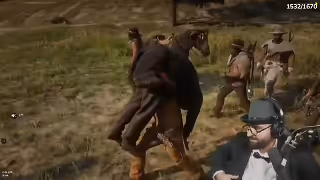 03:44:08Der Stream beginnt mit dem Einkaufen in einer Spielwelt, wobei der Streamer interaktiv mit der Community interagiert und um Unterstützung bittet. Es werden verschiedene Gameplay-Elemente wie ein verbessertes Lasso und die Kutsche erwähnt. Kurz darauf wird ein Kopfgeldj gestartet, was zu einer Verfolgungsjagd durch Neandertaler führt. Der Streamer muss fliehen, ist aber aufgrund eines Server-Bugs in einem Raum gefangen und kann seinen Hut nicht anziehen.