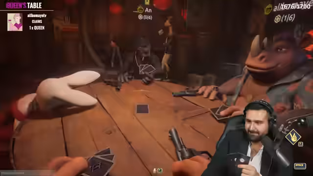 05:25:06Die ersten Runden werden genutzt, um die Spielregeln des Kartenspiels "Liar's Deck" zu erklären. Jeder Spieler erhält drei Karten. Es gibt Runden, die entweder "König" oder "Dame" oben links anzeigen. Ein Spieler muss eine passende Karte legen, darf aber auch lügen. Die anderen Spieler müssen entscheiden, ob sie geglaubt werden oder ob sie den Spieler beschuldigen, zu lügen. Bei einer richtigen Beschuldigung schießt man auf den Lügner, bei einer falschen schießt man auf sich selbst. Eine spezielle Karte, die "Mastercard", kann ebenfalls gelegt werden und erlaubt es, einen anderen Spieler gezielt zu beschuldigen.